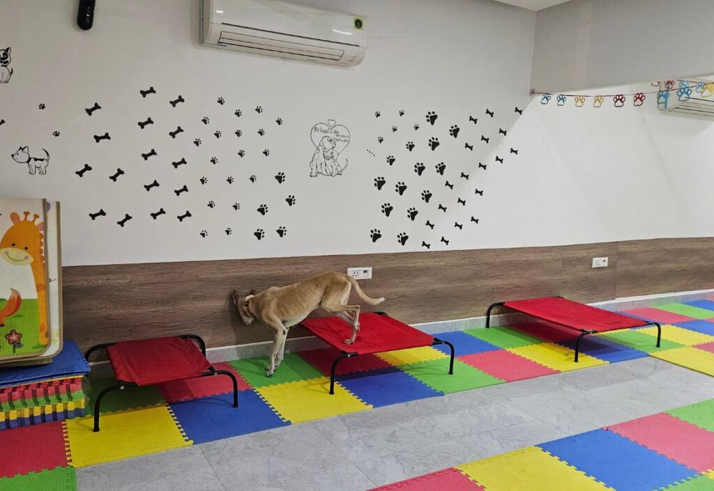 There are no cages — only open, thoughtfully designed spaces where pets can move freely, relax, and interact under supervision.